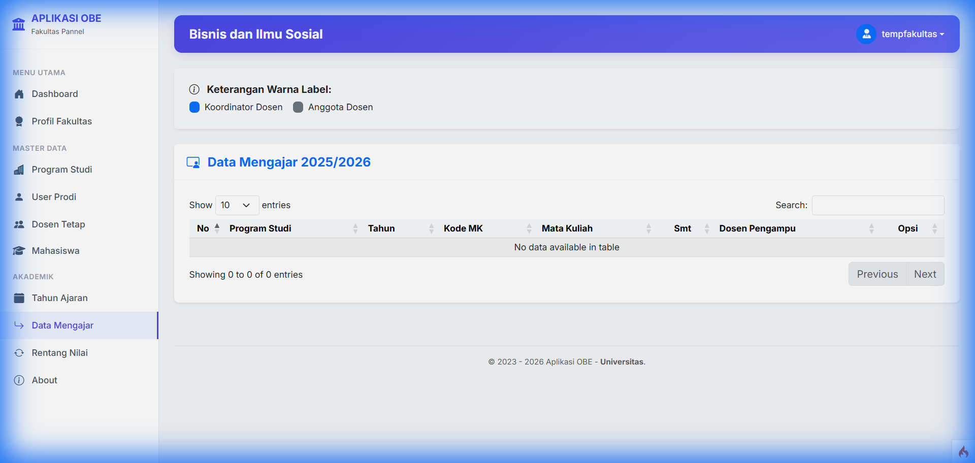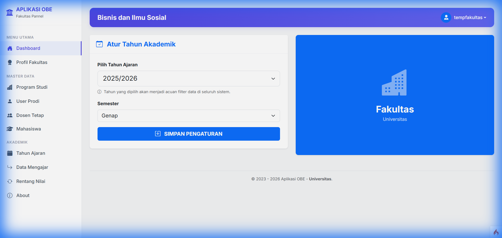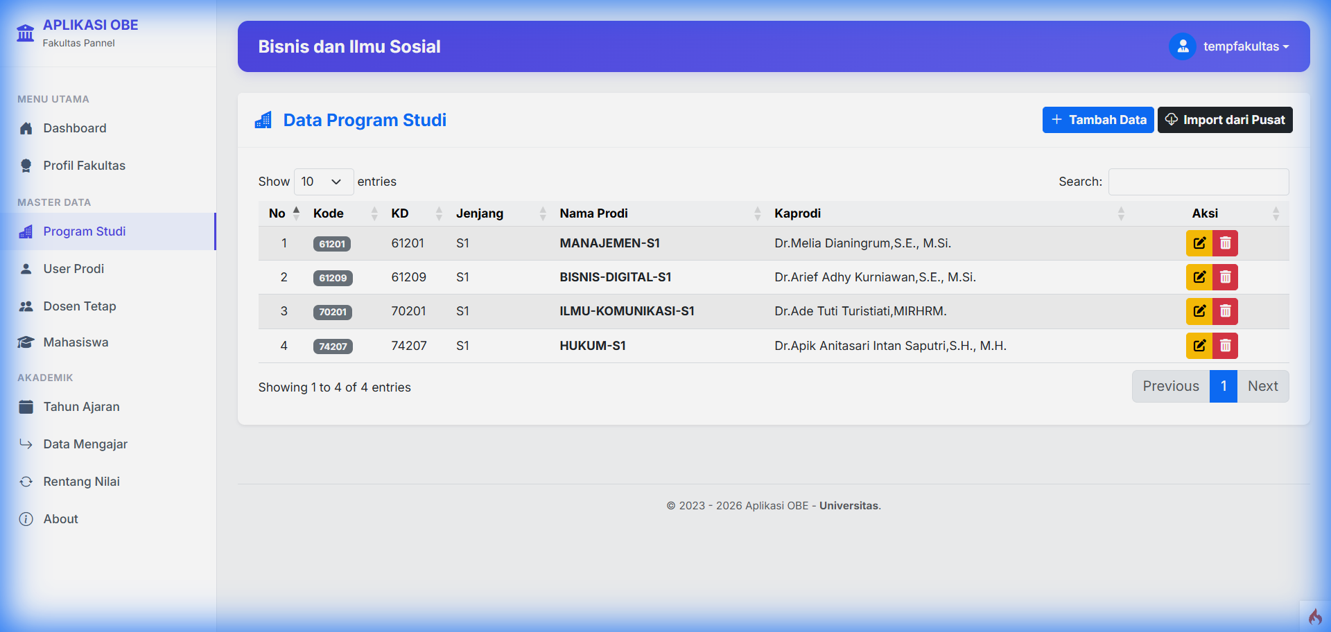 Pengguna dengan role Fakultas memiliki otoritas untuk memantau dan mengelola data akademik di tingkat fakultas, serta mengoordinasikan Program Studi di bawahnya.