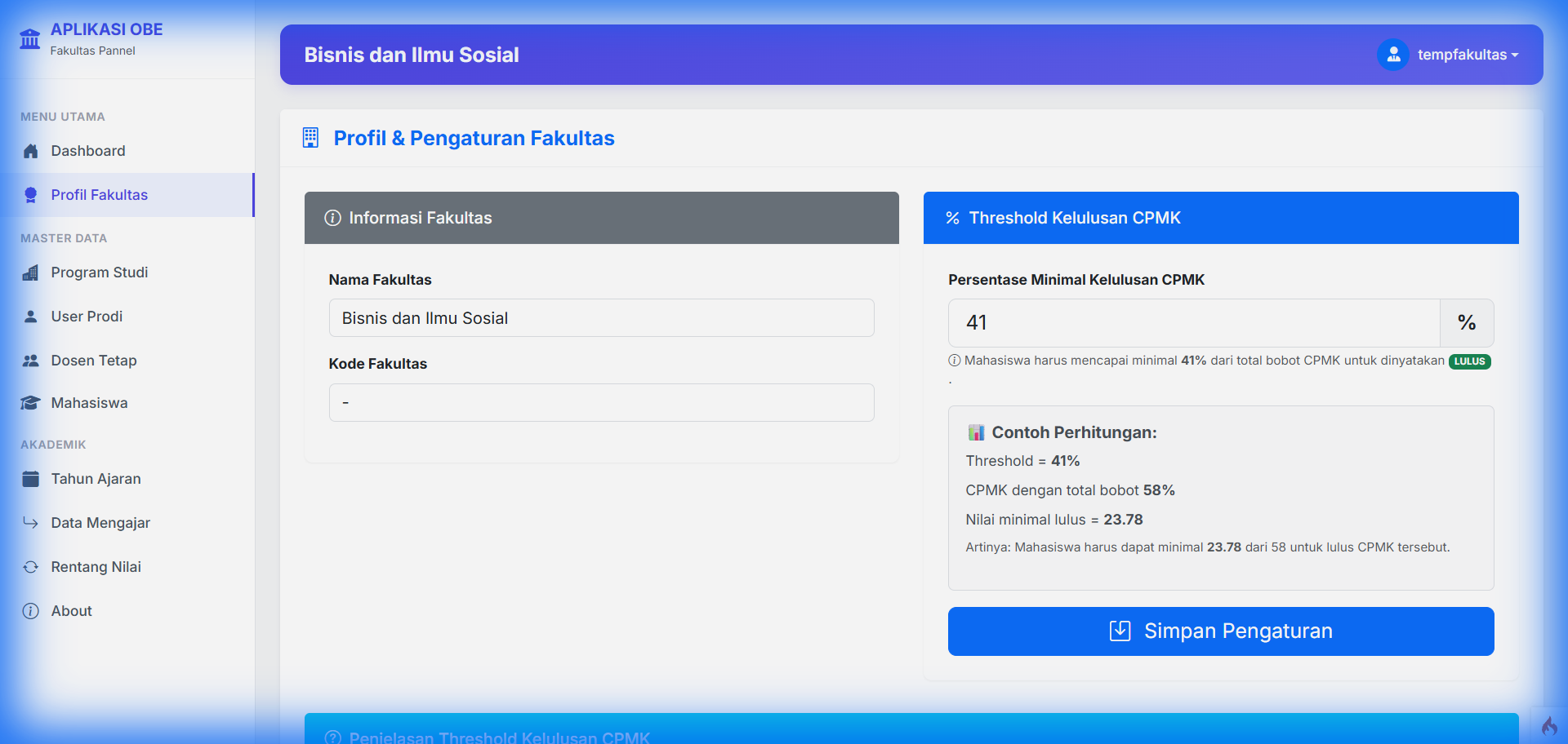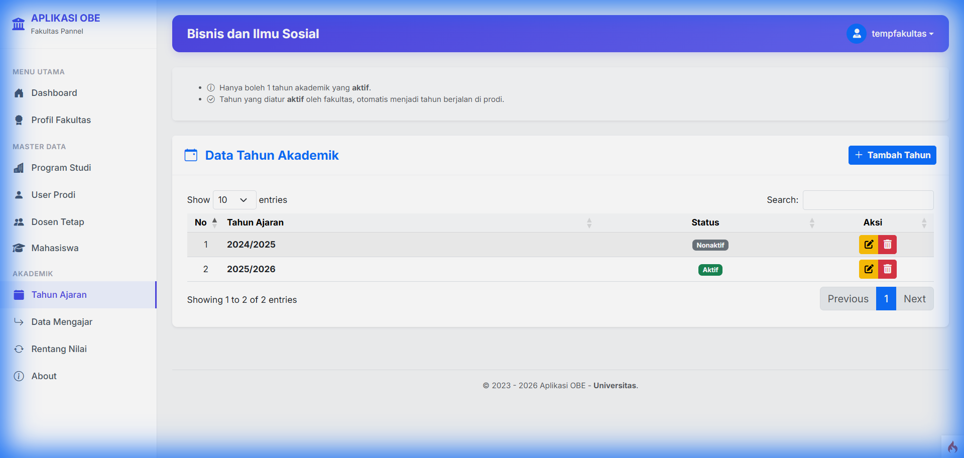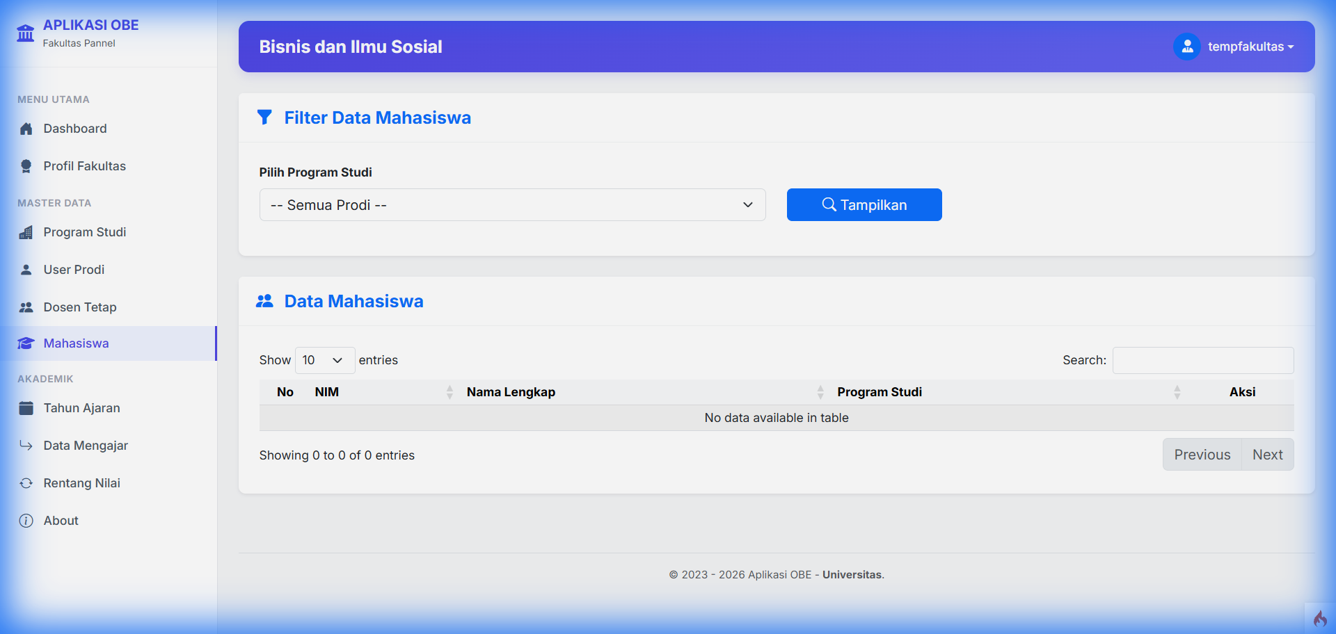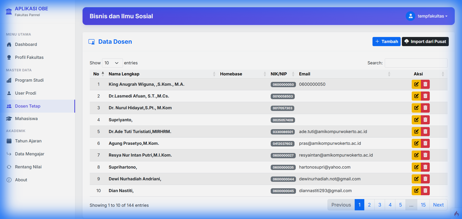 Pengguna dengan role Fakultas memiliki otoritas untuk memantau dan mengelola data akademik di tingkat fakultas, serta mengoordinasikan Program Studi di bawahnya.