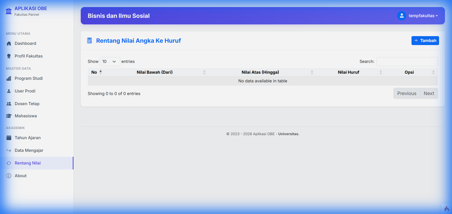 Pengaturan standar nilai huruf (A, B, C, dst) tingkat fakultas yang berlaku untuk seluruh prodi.